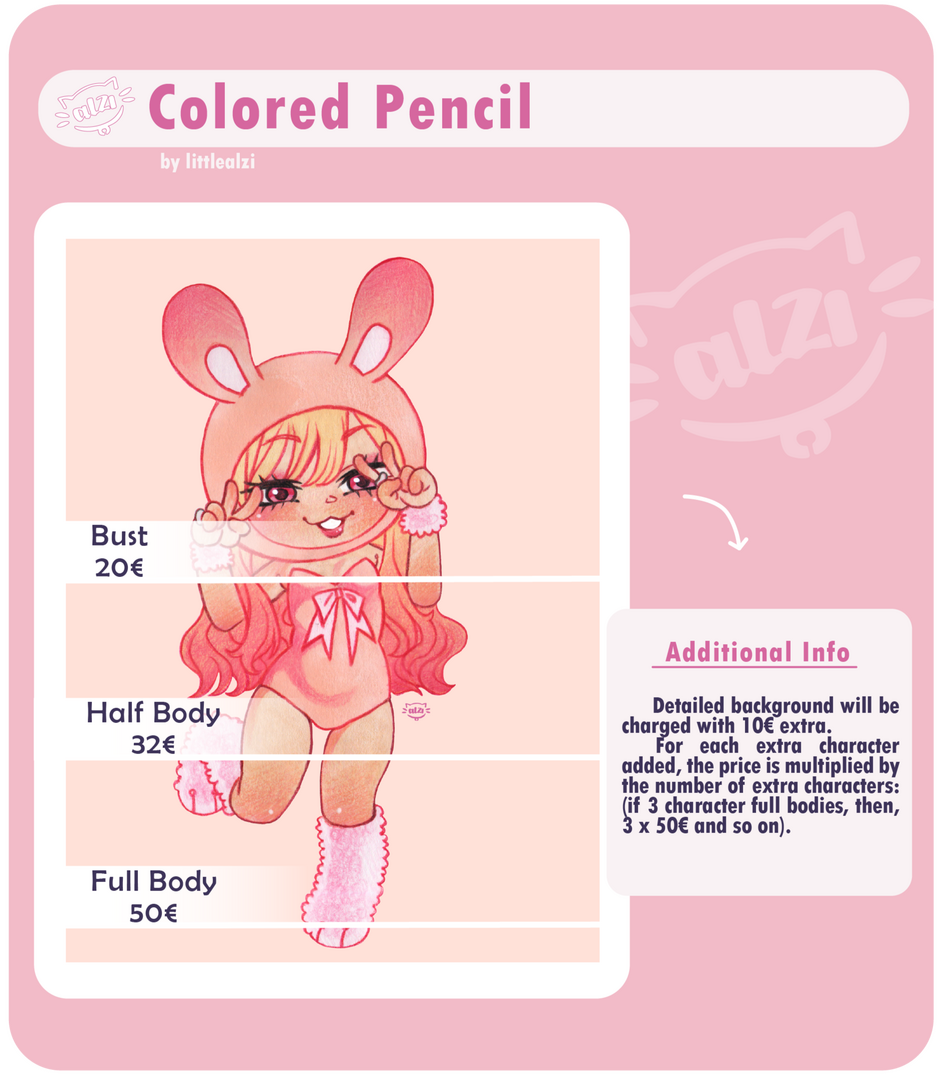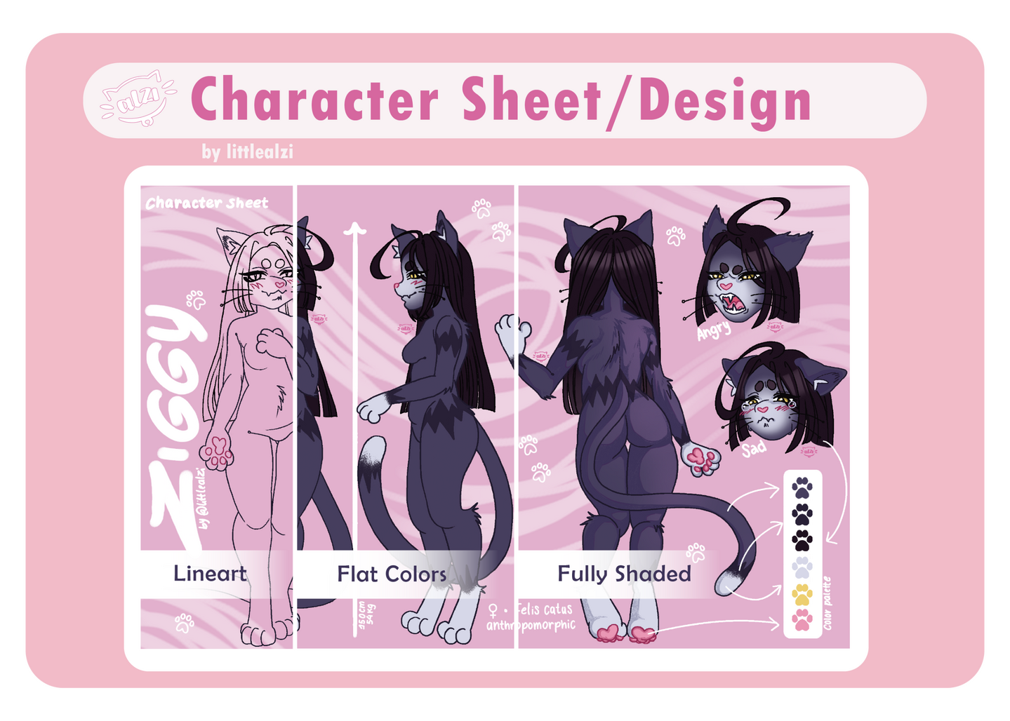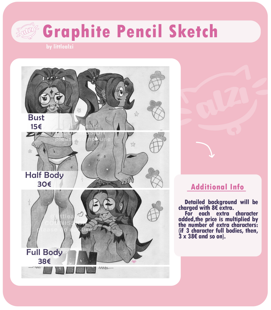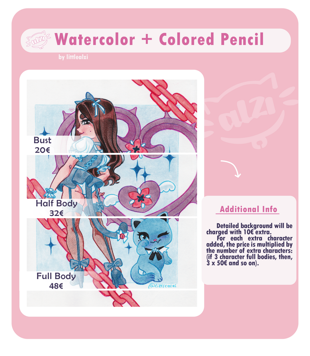 80€ (lineart only)Any extras will be charged with +8€ each.Character Sheet