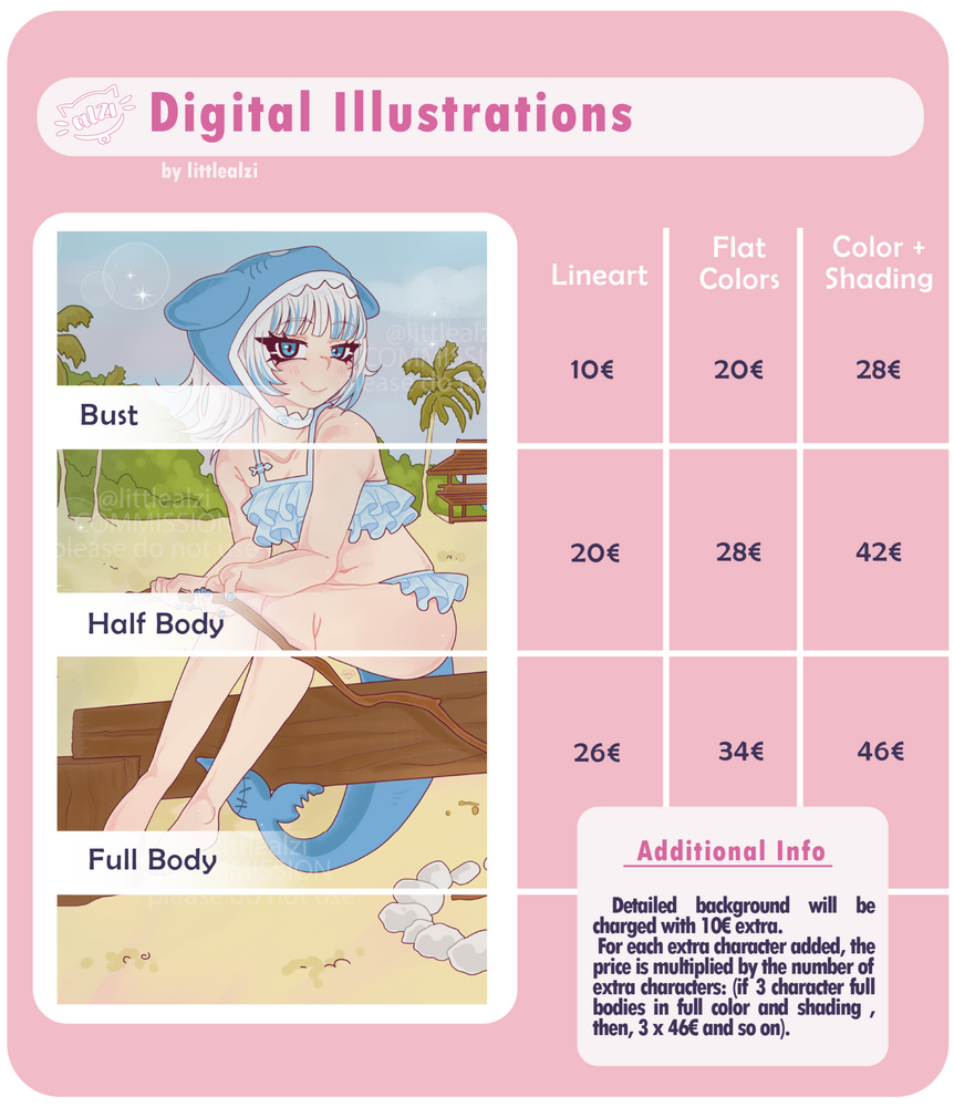 60€ (lineart only)Any extras will be charged with +6€ each.